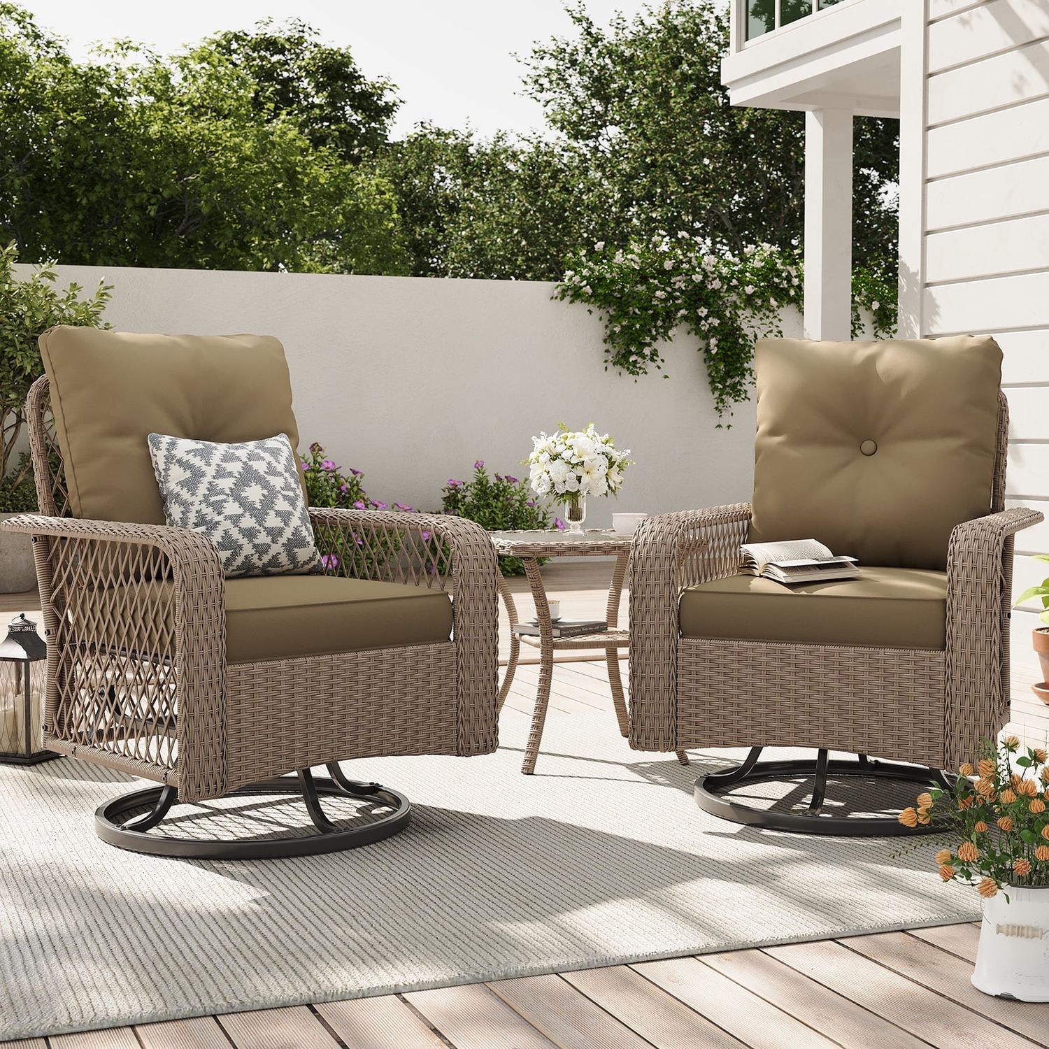 ELPOSUN 3 Pieces Patio Furniture Set, Outdoor Swivel Gliders Rocker, Wicker Patio Bistro Set with Rattan Rocking Chair, Glass Top Side Table and Thick