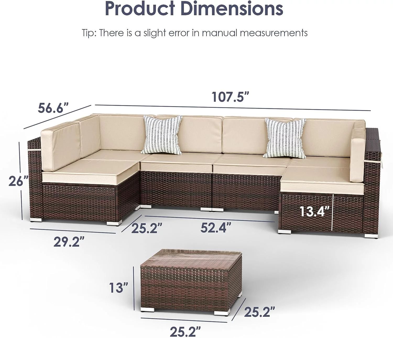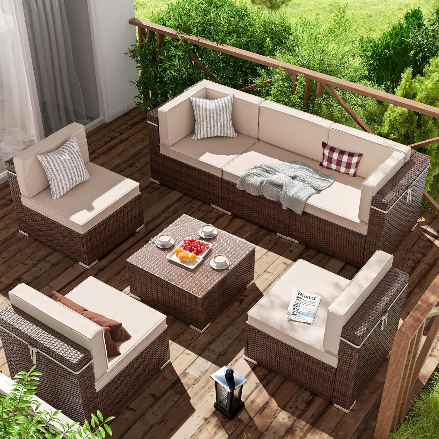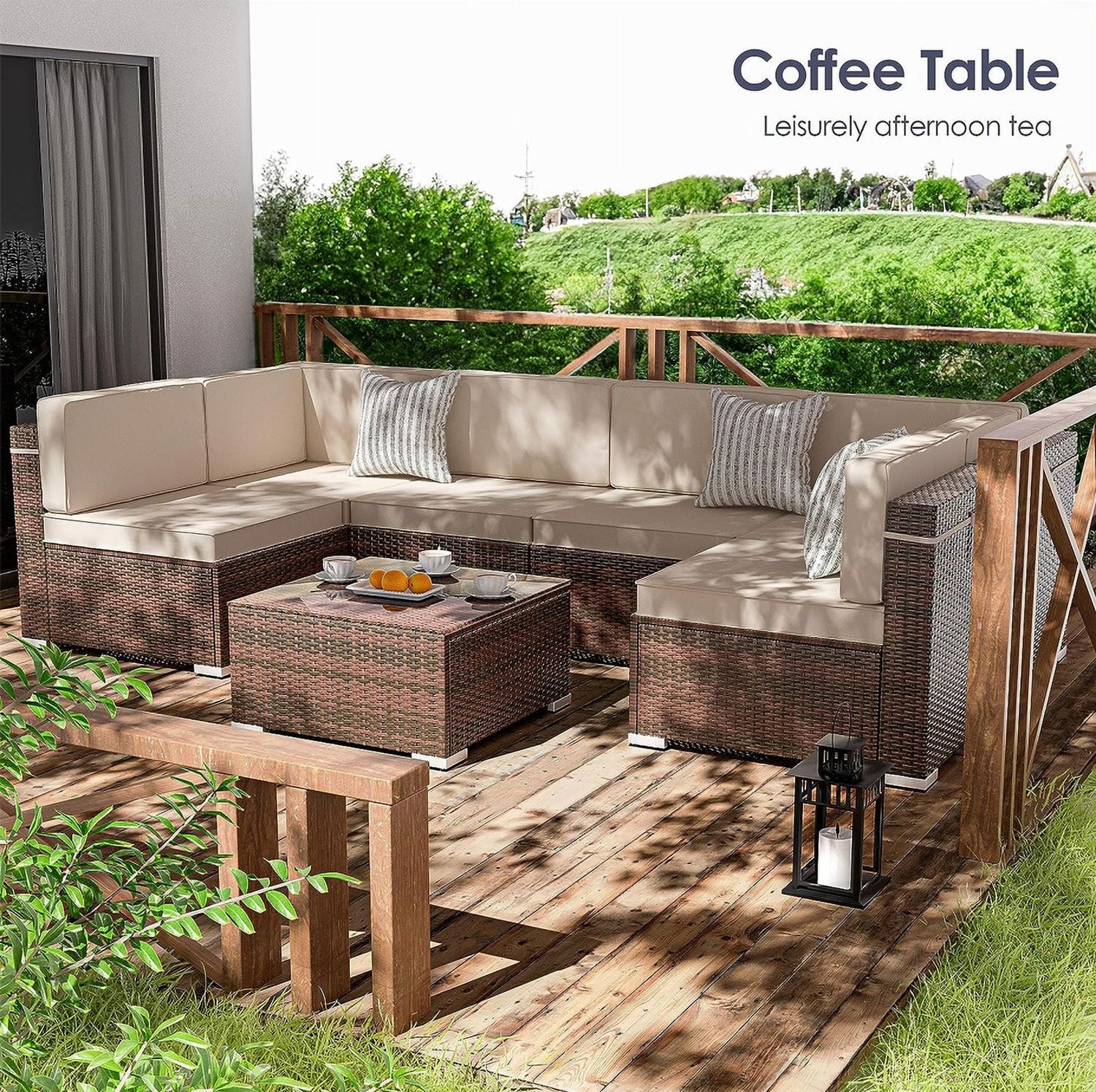 ELPOSUN 7 Pieces Patio Furniture Set All Weather Outdoor Sectional Sofa, Outdoor Modern Sectional Furniture Wicker Couch with Glass Coffee Table