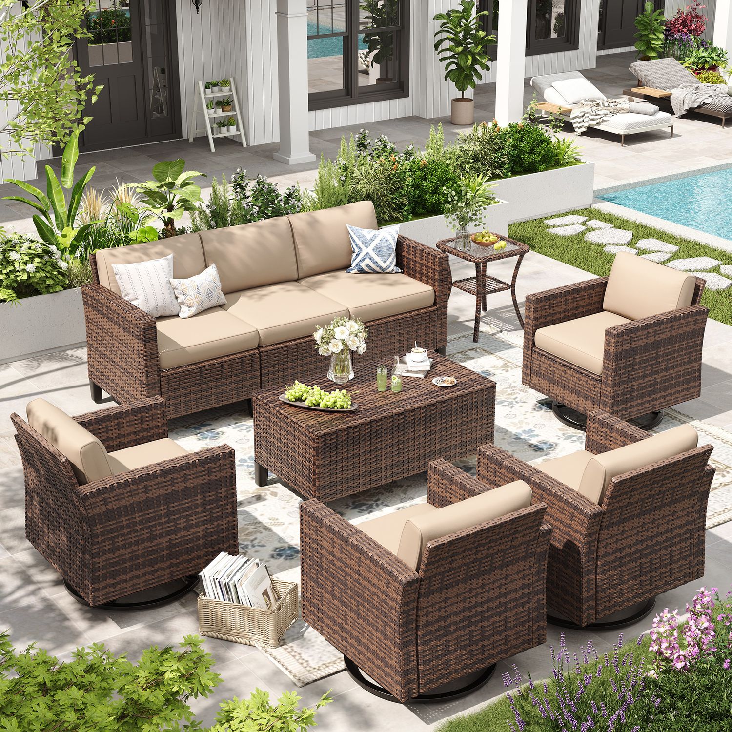 ELPOSUN Patio Furniture 10 Pieces Wicker Outdoor Sectional Sofa Sets, Rattan Conversation Set with Storage Table, Swivel Chairs for Backyard, Pool, Beige��Include Waterproof Covers ��