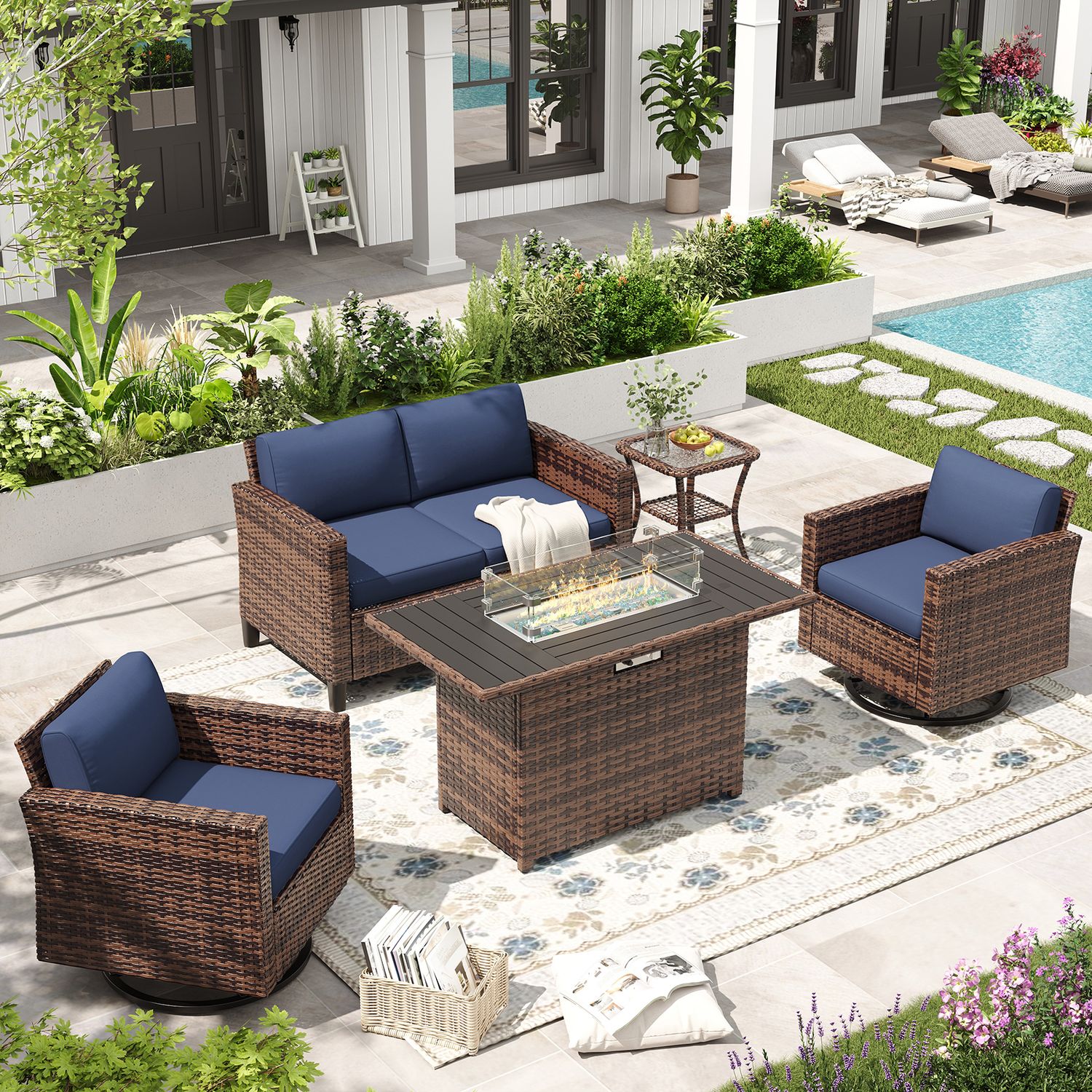ELPOSUN Patio Furniture 6 Pieces Wicker Outdoor Sectional Sofa Sets, Rattan Conversation Set with Fire Pit Table, Swivel Chairs for Backyard, Pool, Beige/Navy Blue/Grey��Include Waterproof Covers ��