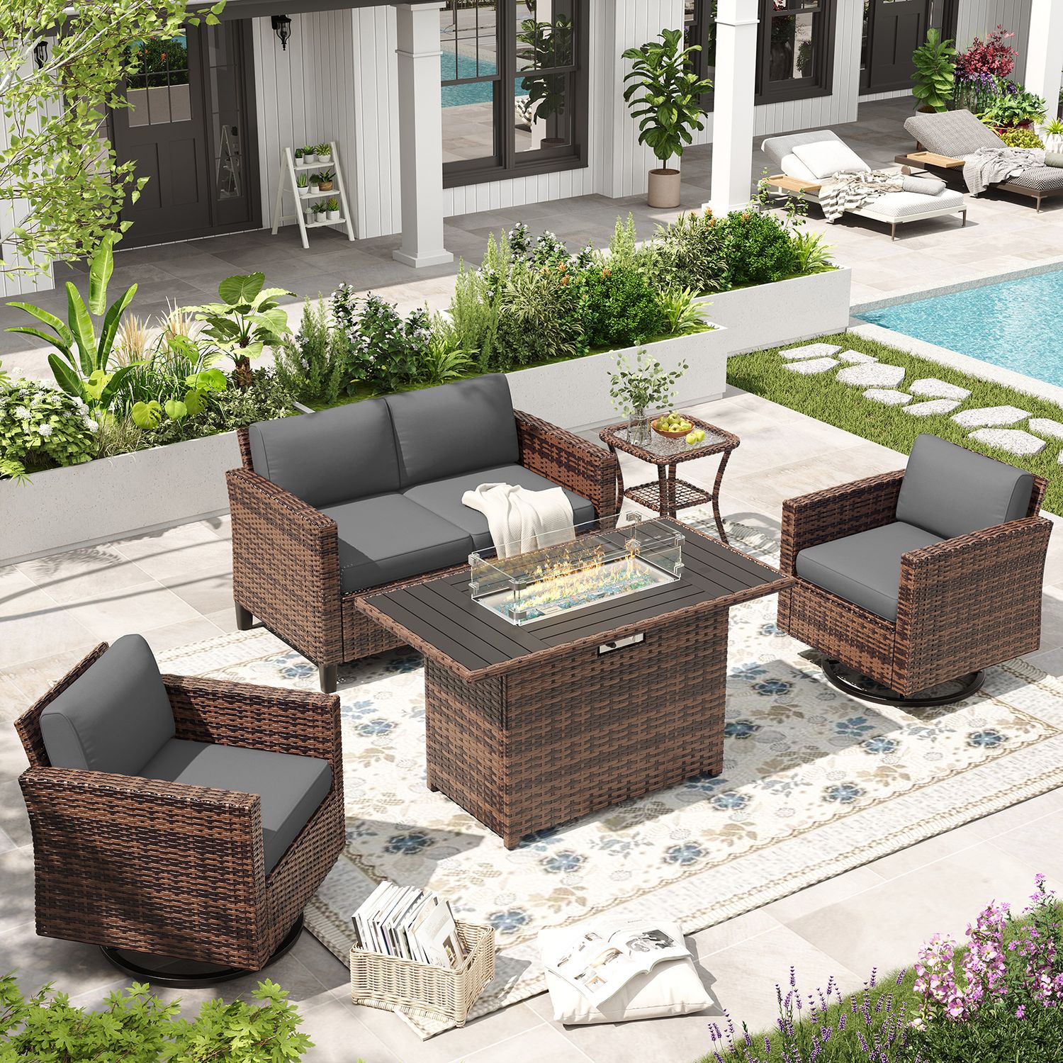 ELPOSUN Patio Furniture 6 Pieces Wicker Outdoor Sectional Sofa Sets, Rattan Conversation Set with Fire Pit Table, Swivel Chairs for Backyard, Pool, Be